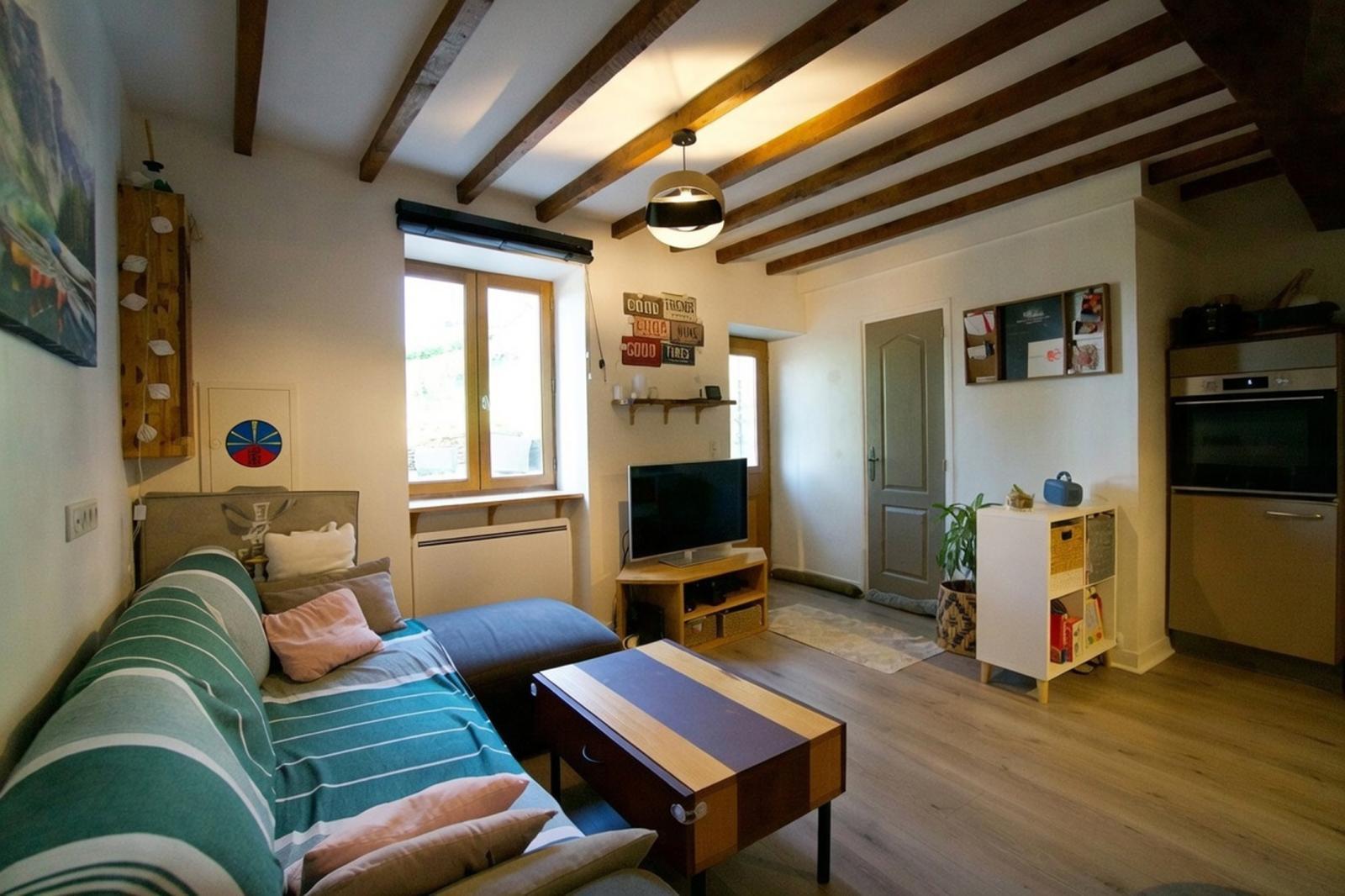 Au rez-de-chaussée, vous découvrirez un agréable séjour avec cuisine ouverte, ainsi qu’un WC indépendant.