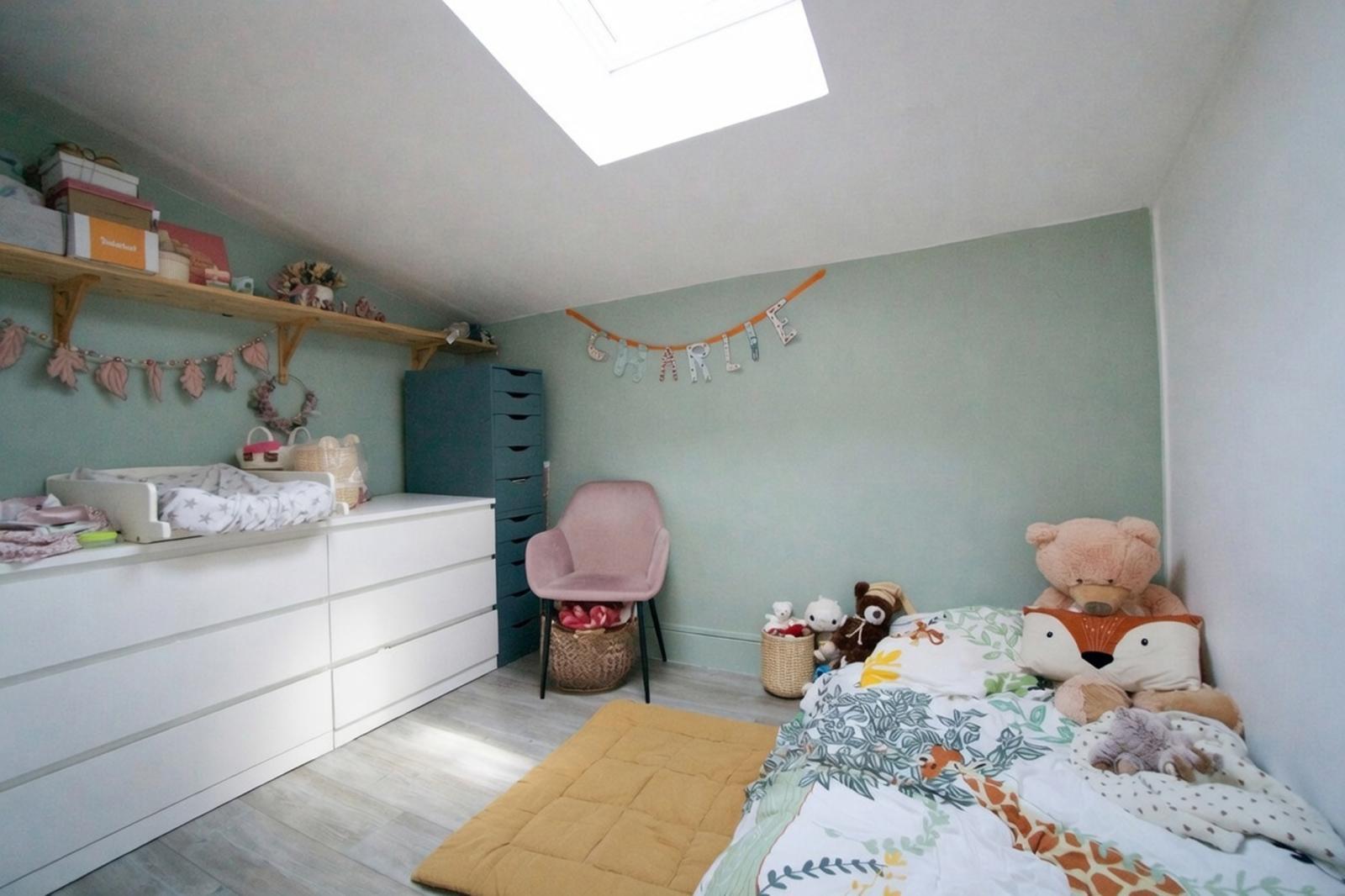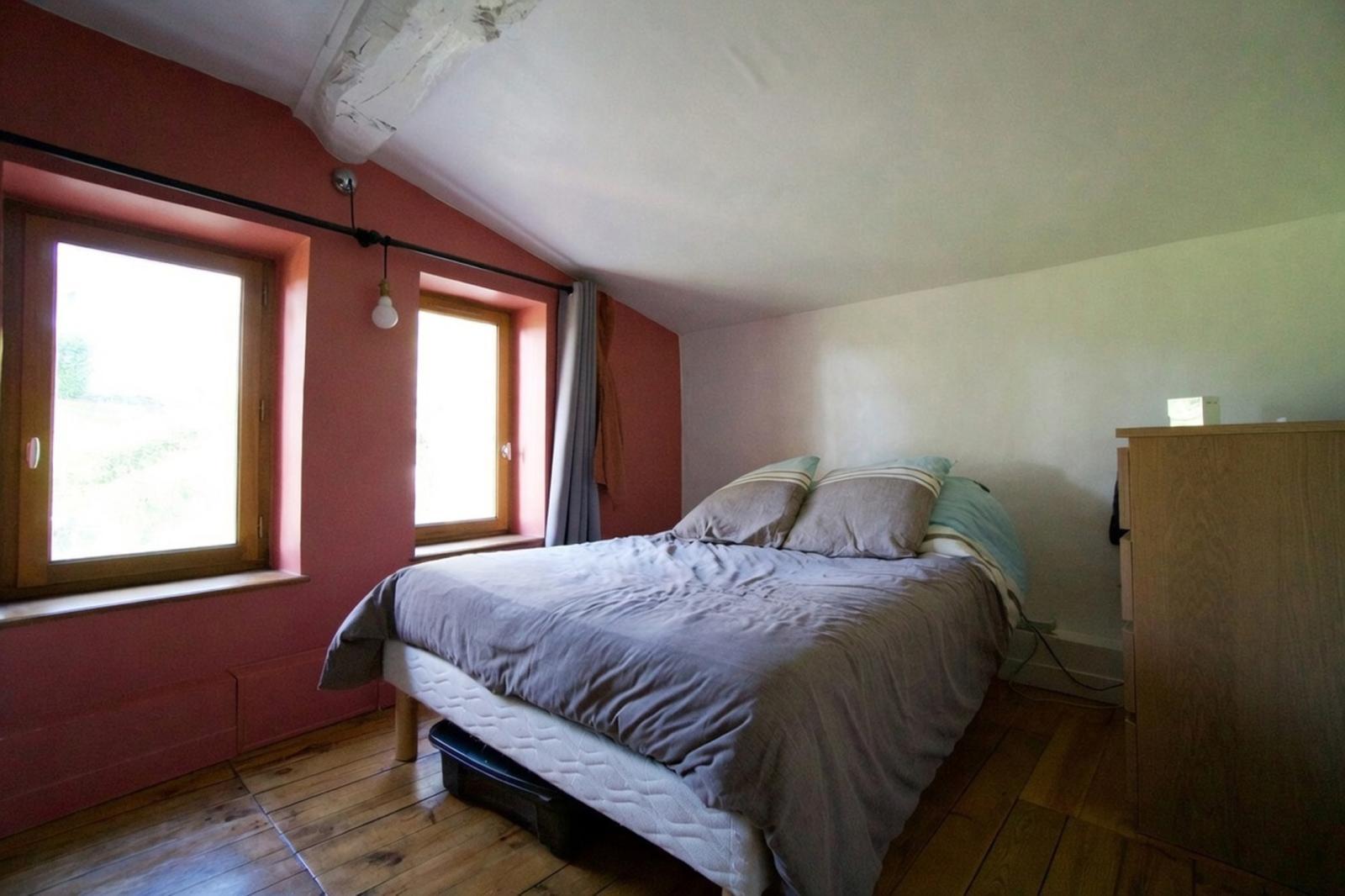 L’étage se compose de deux chambres et d’une salle de bains.