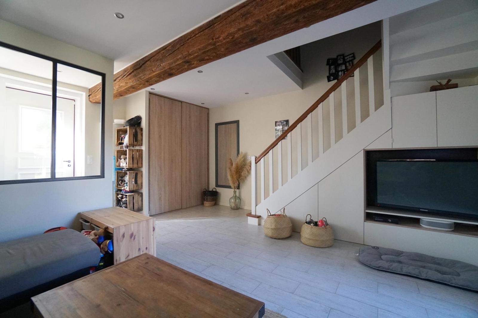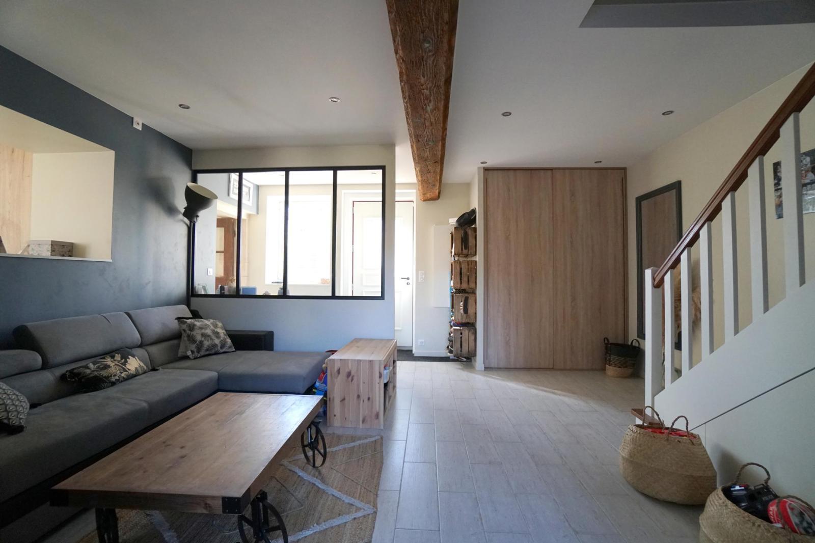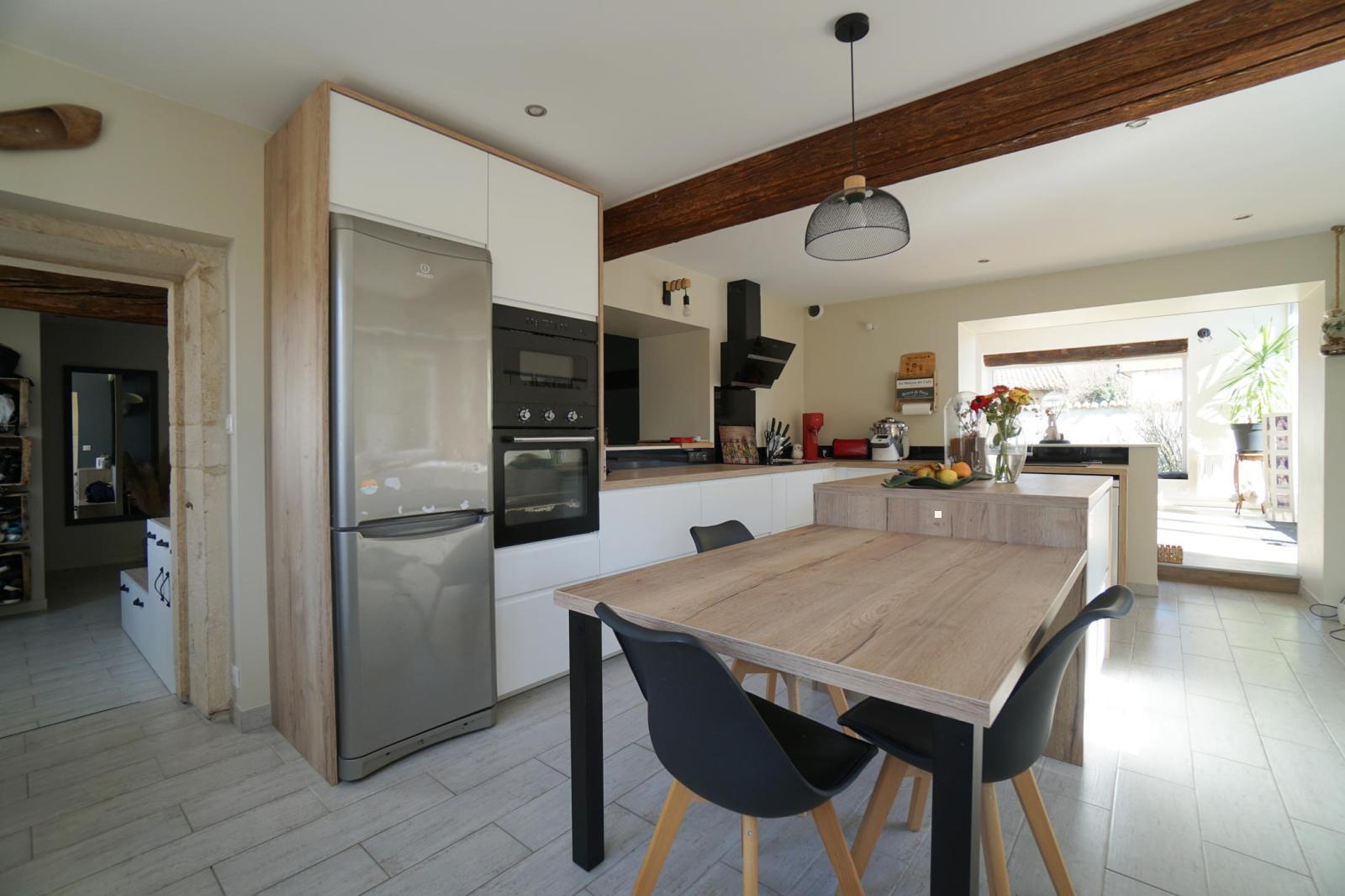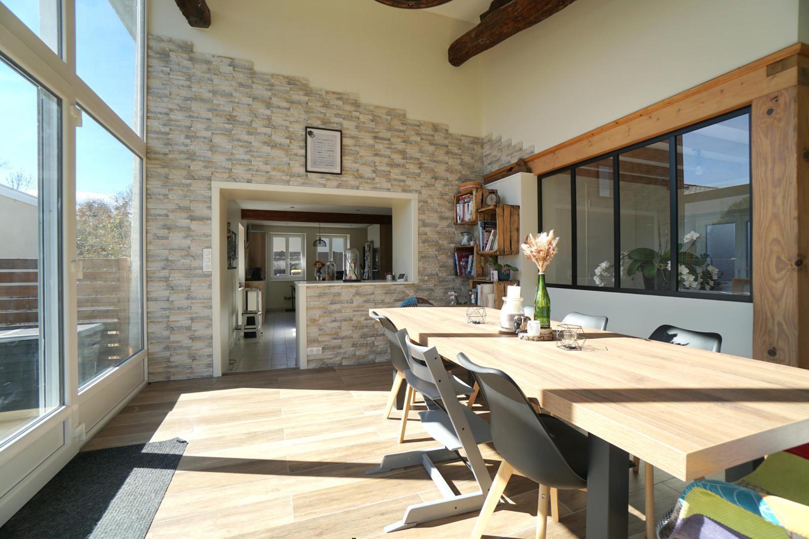Cette maison, rénovée en 2016, a conservé son charme. Elle propose un espace de vie spacieux et lumineux en trois volumes distincts, une cuisine semi-ouverte sur le séjour déplafonné, un agréable salon avec cheminée à bois.
