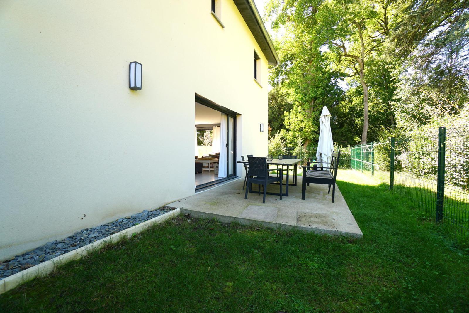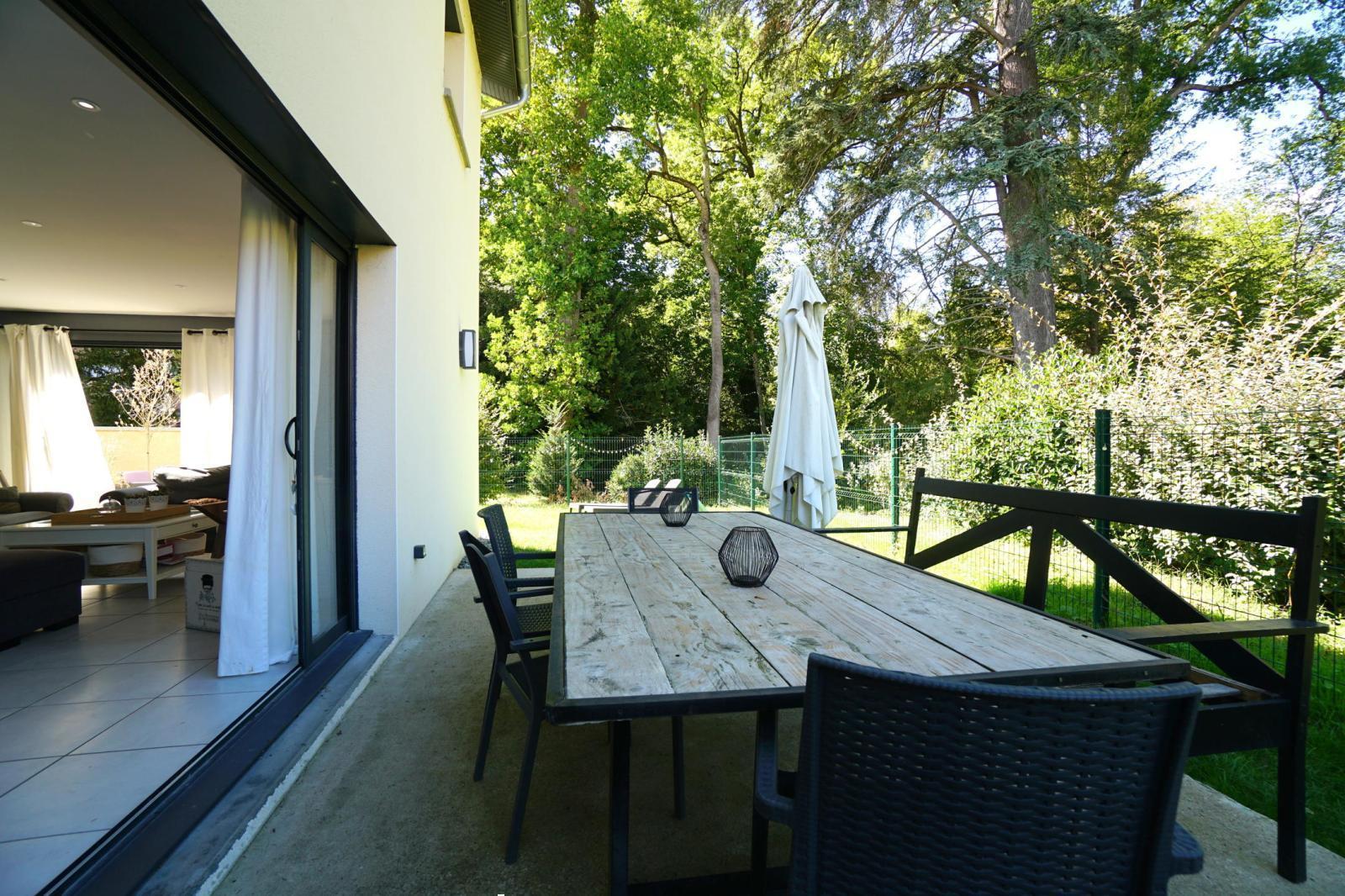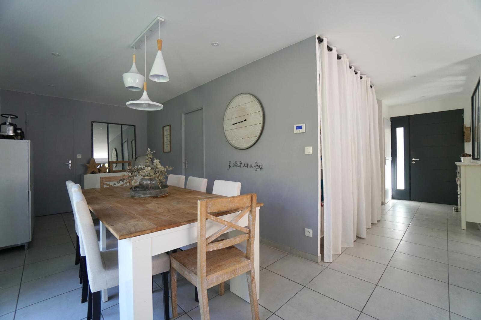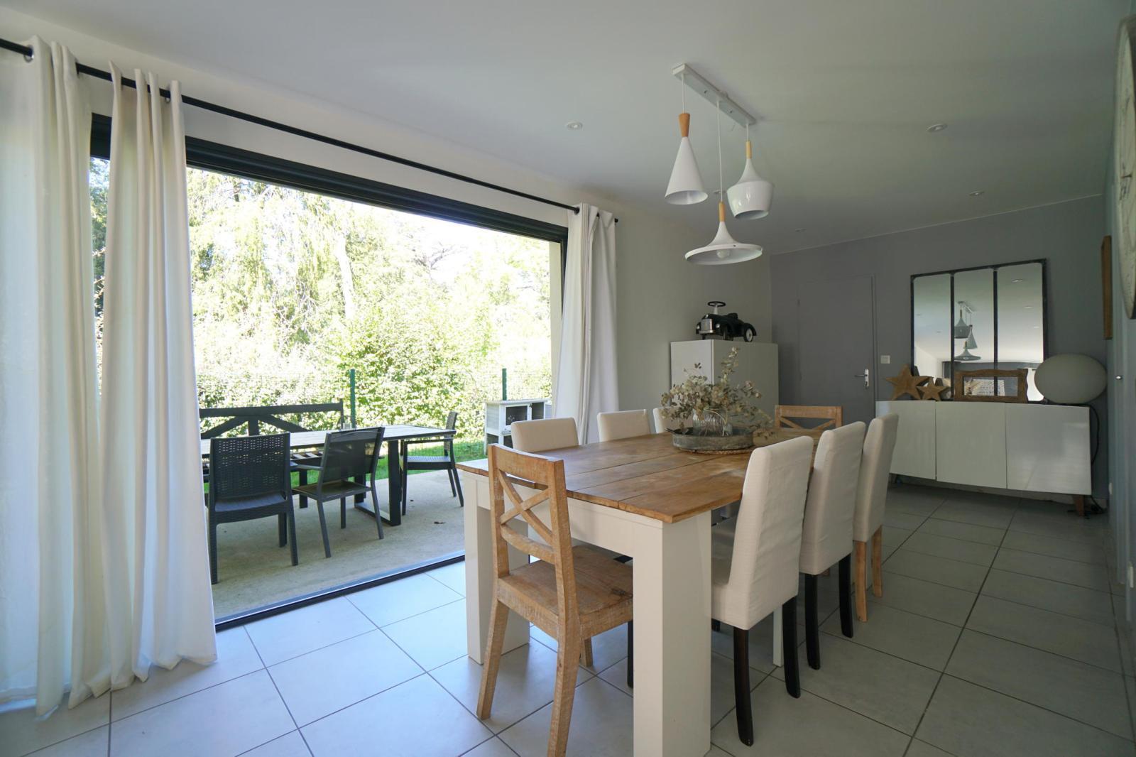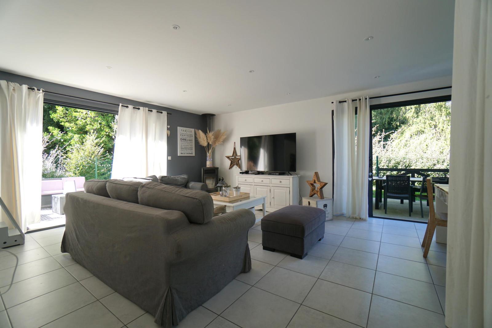 Elle propose une agréable pièce à vivre de 50m² orientée Sud, Ouest et Nord, avec deux baies vitrées à galandages s'ouvrant sur deux terrasses et un terrain clos.