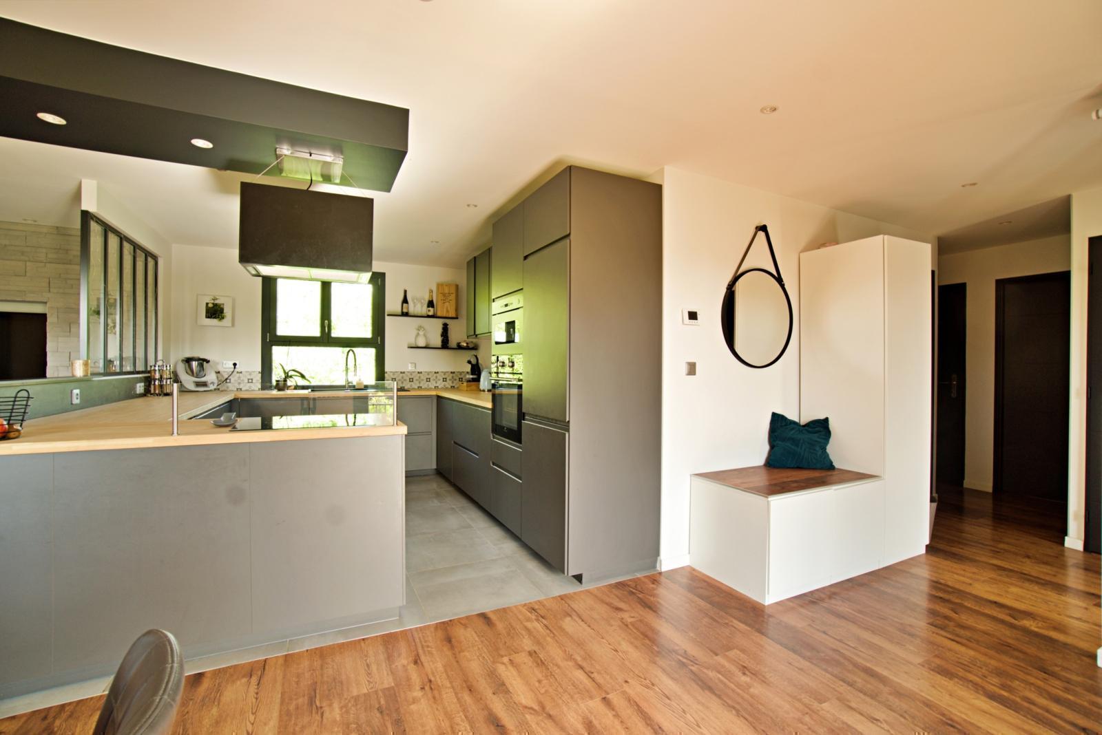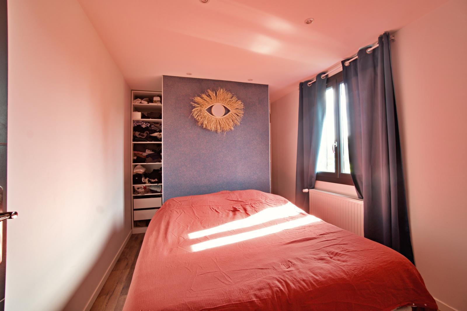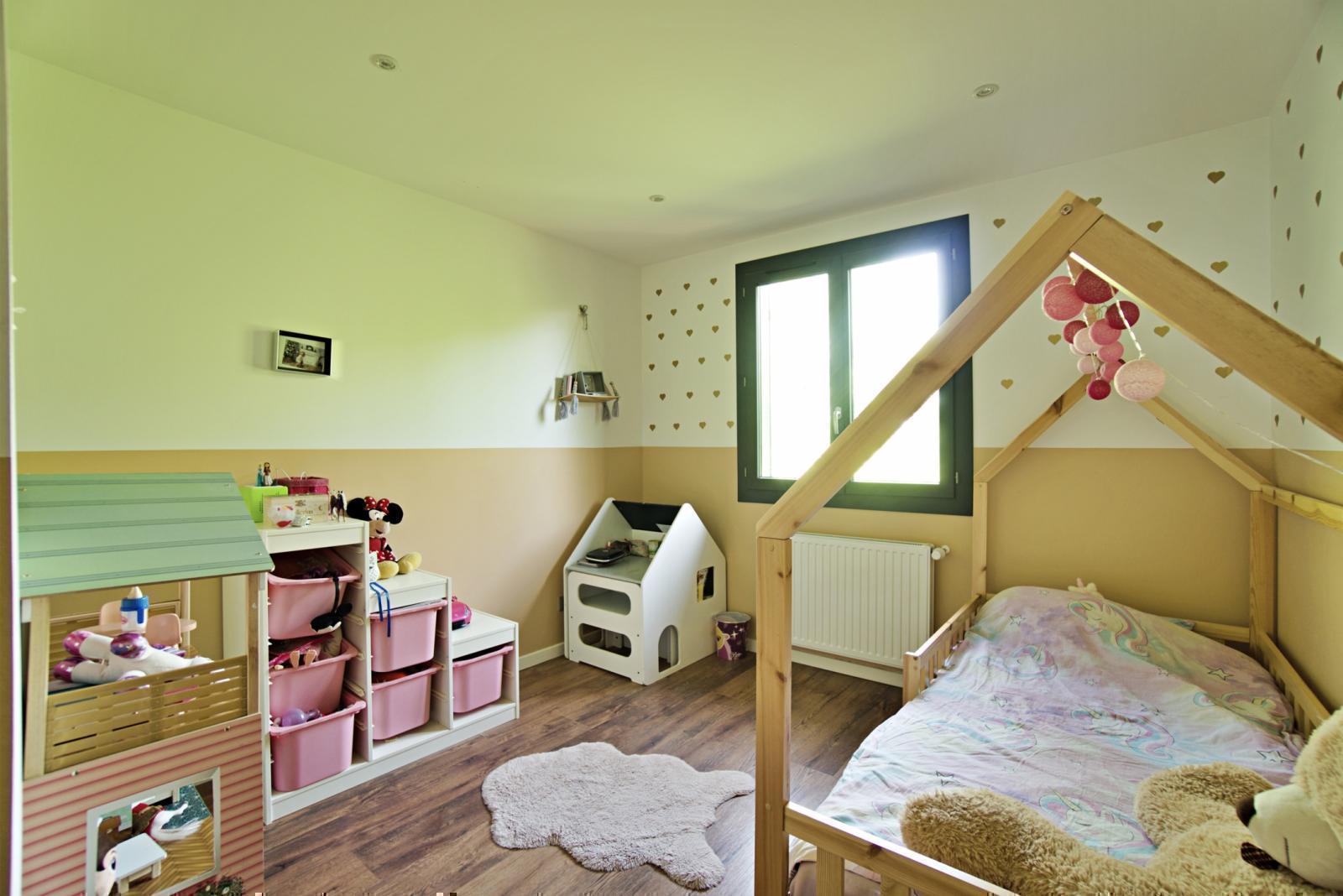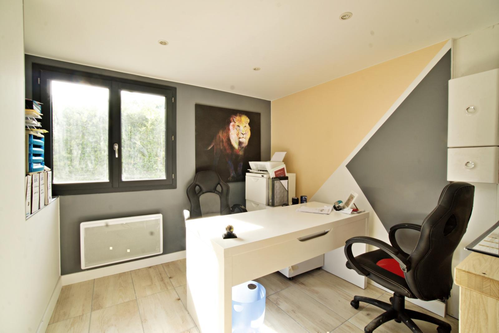 La partie nuit, située au même niveau, dessert trois chambres équipées de placards et une salle d'eau indépendante. Au rez-de-chaussée, vous trouverez une quatrième chambre, un bureau et une buanderie, offrant ainsi un volume de vie confortable et fonctionnel.