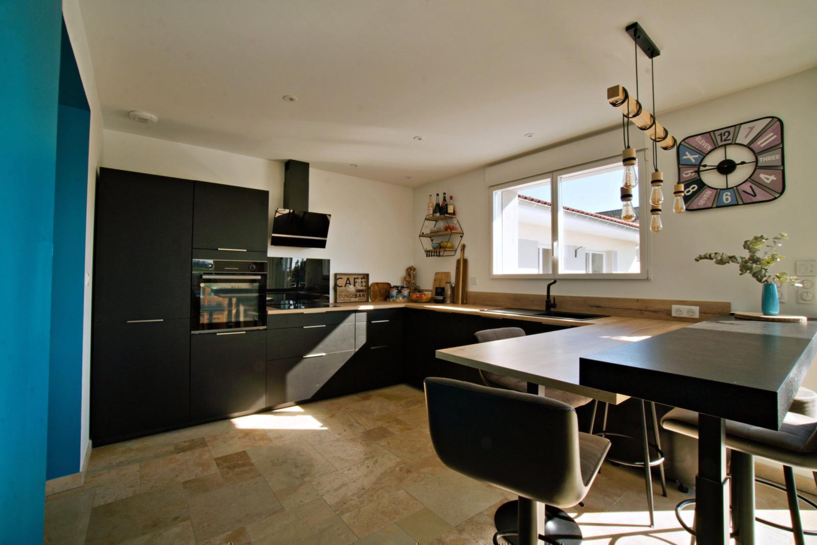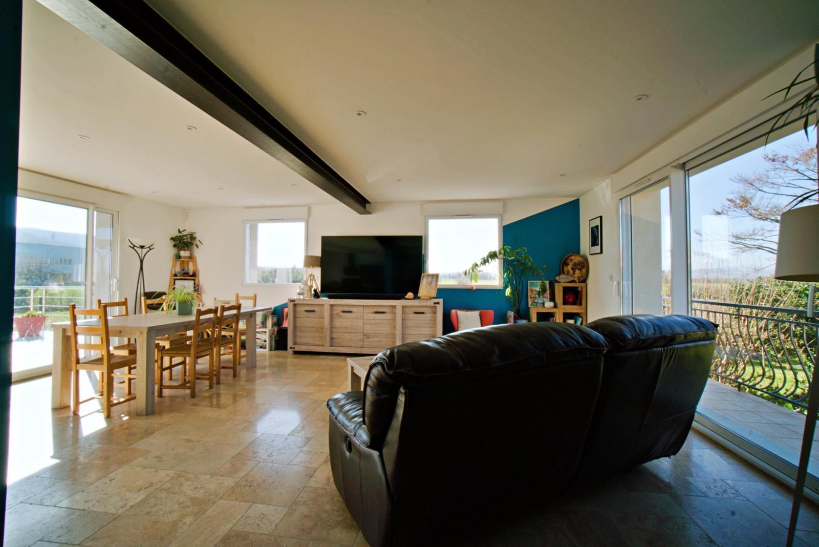 Développant environ 168 m² habitables de plain-pied, la maison s’organise autour d’un bel espace de vie lumineux d’environ 57 m², composé d’un séjour et d’une cuisine ouverte, ouvert sur l’extérieur.