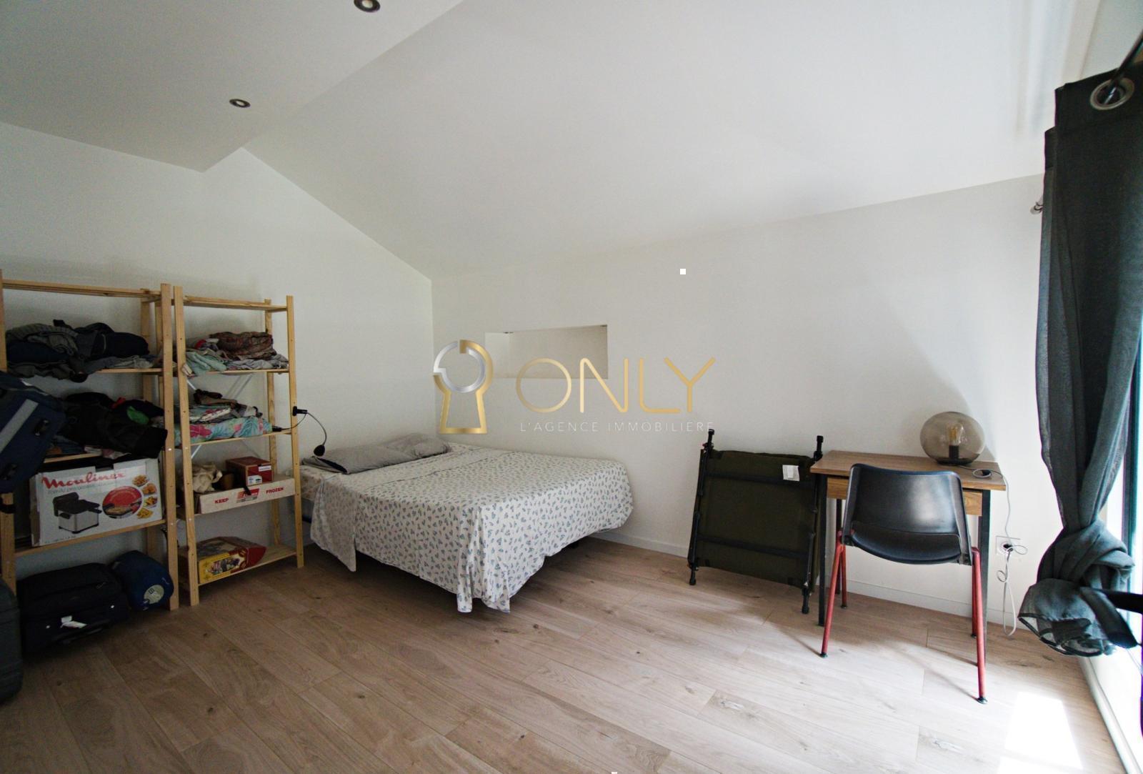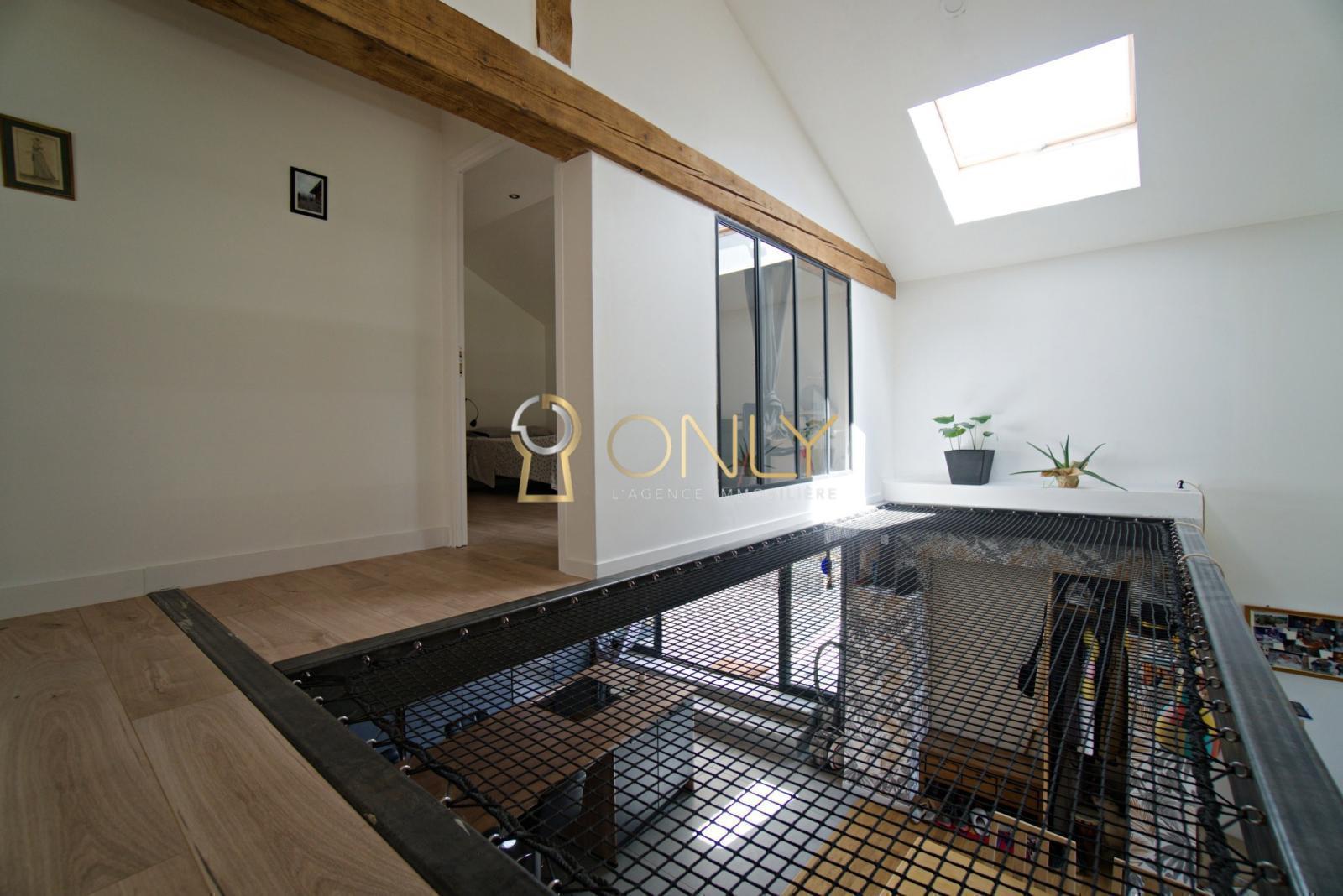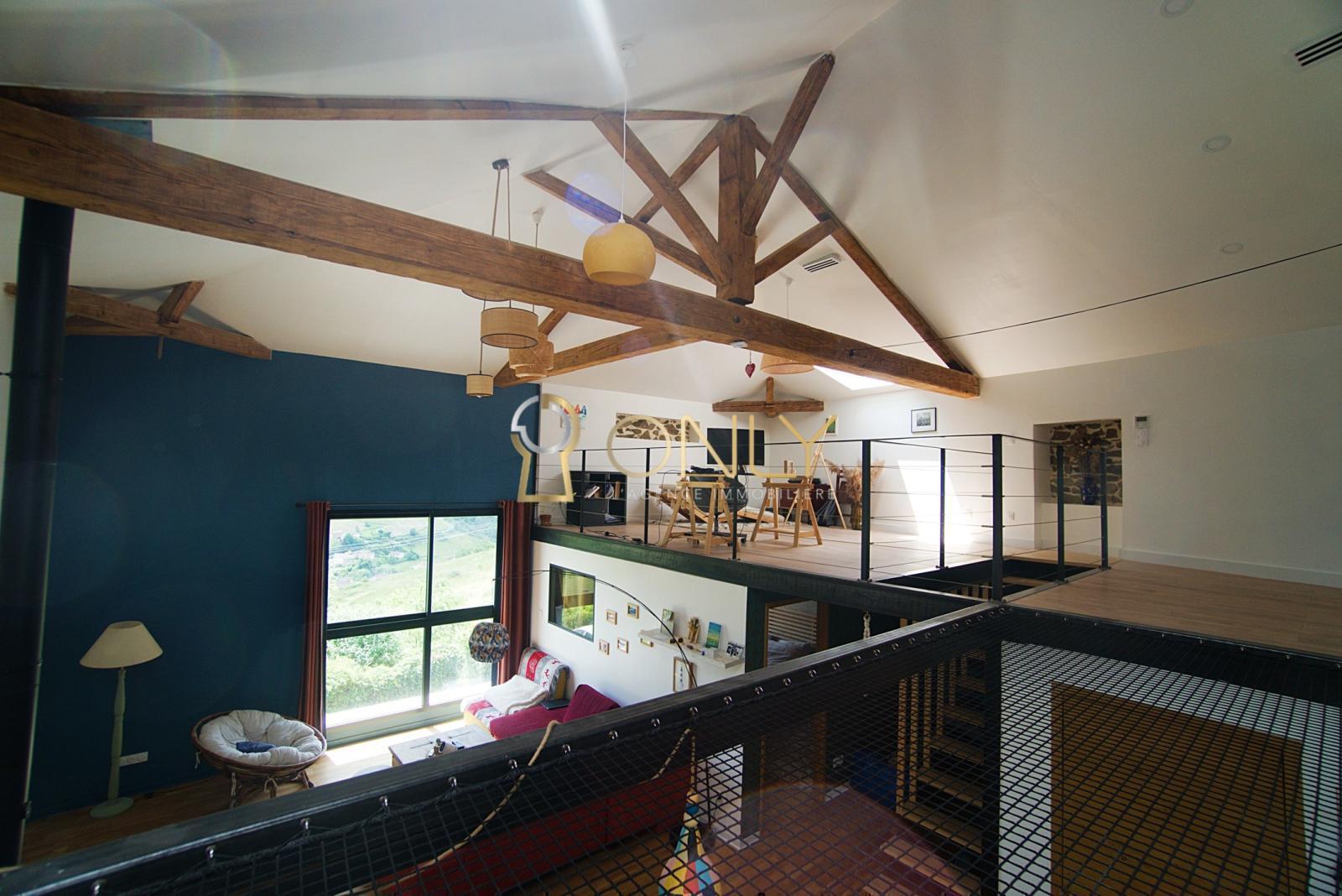 À l'étage, une mezzanine ouverte de 28 m² vous invite à la détente, et un filet a été installé face aux spacieuses baies vitrées, offrant une vue imprenable sur les environs. Deux chambres supplémentaires complètent cet étage.
