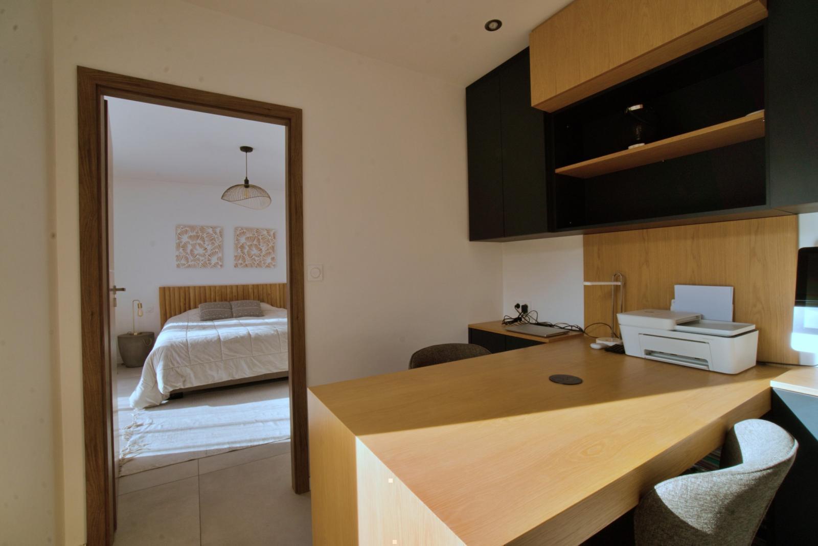 Une cuisine moderne avec îlot central et vue directe sur la piscine, un salon TV cosy, idéal pour les soirées en famille, trois suites parentales au rez-de-chaussée, chacune avec salle d’eau ou salle de bains et dressing.
